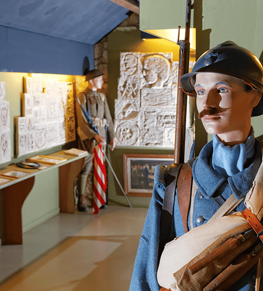 Plats d’étain, rondes-bosses et figurines de papier vous entraînent dans la tourmente révolutionnaire jusque dans les sables d’Egypte, terrible campagne du général Bonaparte. Les dioramas des poilus vous replongent dans la première guerre mondiale avec traversée de village, conduite de prolonges d´artillerie, mise en batterie, chars d´assaut, arrivée des troupes sénégalaises, conduite des trains d´équipage et construction de « boyaux ».