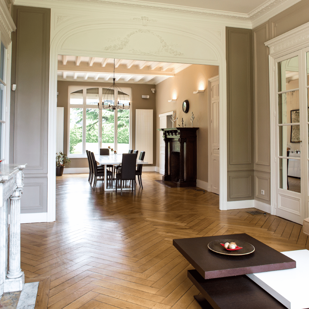 Le propriétaire a redonné à ce château une allure chic et contemporaine, tout en mettant en valeur son principal atout : l’espace. La grande salle à manger, ouverte sur le salon, permet de profiter pleinement de ce lieu de convivialité, tout en admirant la vue traversante sur le domaine.