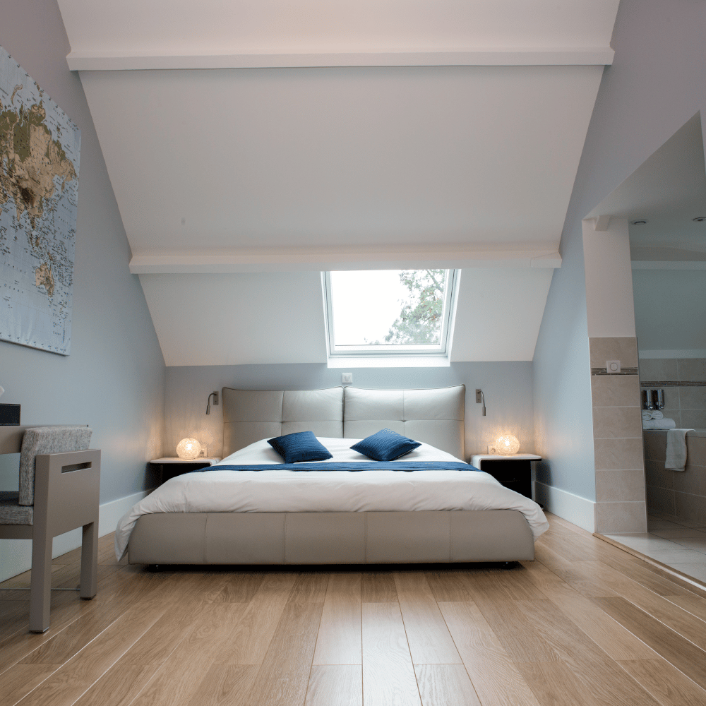 La chambre du bas, avec sa décoration épurée et sobre dans des tons de gris, blanc, beige et taupe, invite à la détente et à la sérénité. La chambre du haut, plus chaleureuse, se distingue par ses tonalités de rouille, gris et noir, et ses poutres apparentes qui ajoutent un charme authentique à cette demeure pleine de caractère.