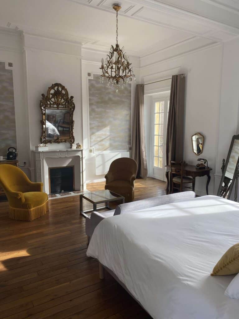 La maison propose cinq chambres d’hôtes au premier étage, décorées avec soin, dont certaines disposent d’un salon privatif. Un grand salon commun, chaleureux et accueillant, invite à la détente autour d’un thé ou d’un café. Le petit-déjeuner, servi dans l’ancienne salle à manger ornée de portraits de famille, ajoute une touche d’authenticité à votre séjour.